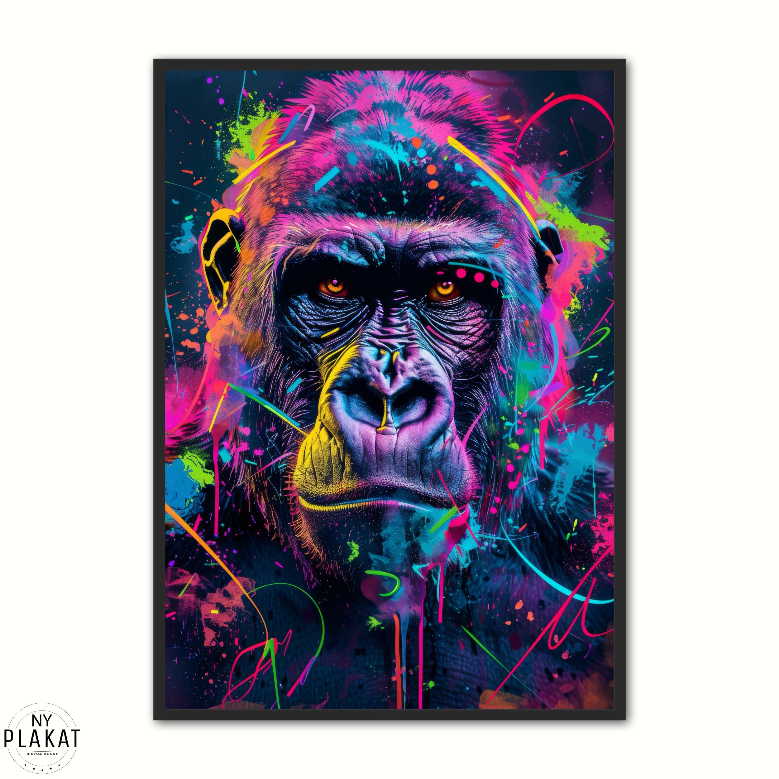 Velkommen til en verden af kreativt mod og udtryksfuld fantasi med Gorilla Plakat 28. Denne unikke plakat præsenterer en forfriskende og dristig tolkning af en gorilla, hvor digitale graffiti-elementer møder strålende neonfarver. Udforsk dette levende billede, hvor den kraftfulde udstråling af gorillaen bliver fremhævet mod baggrunden af surrealistisk digital kunst.