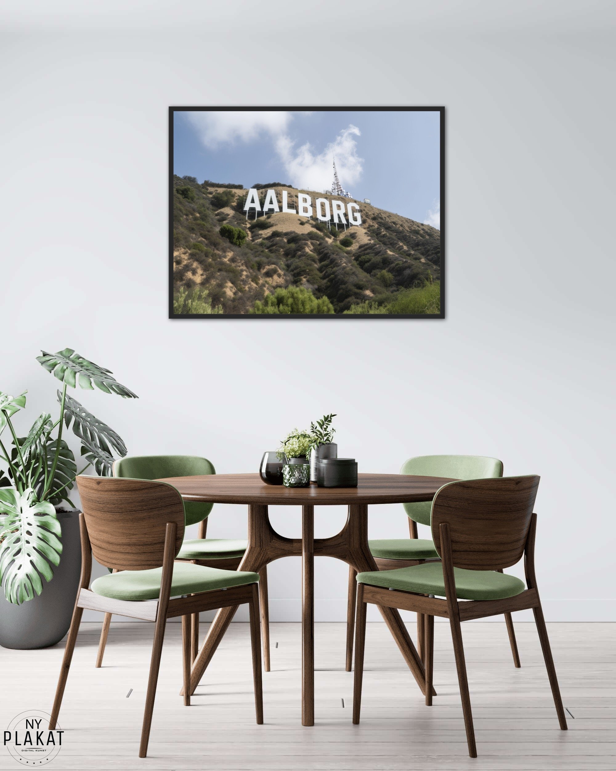 Hollywood Inspiration: Aalborg-skiltet er præsenteret i stil med det verdensberømte Hollywood-skilt, hvilket giver et overraskende og spændende twist til plakatens design og vækker interesse fra både lokale og besøgende.